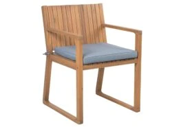 With this wooden set in a simple style, you can create a stylish meeting place in the garden or on the patio for your friends and family. Crafted from acacia wood with a trendy slatted design, it blends well with any outdoor décor. The clean-lined table provides enough space for 6 people. Designed with fitted armrests, wide seat and sled base, the set guarantees durability and longevity. Every chair comes with an additional cushion in a trendy colour, elevating the sitting comfort and the look of the whole set.