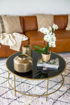 Make your interior glamorous with this spacious, round coffee table. Featuring a durable frame, made out of metal and coated in stylish, golden colour, combined with black table top, this piece is as elegant as it is functional. Place it in your living room or office, to bring a touch of style.
