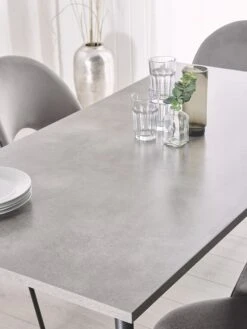 The stylish combination of the table top with a concrete look and black legs makes this table a perfect piece for both modern and traditional settings. Powder coated metal legs ensure stability while the elegant top, made of durable particle board with melamine finish, makes it an extremely versatile piece. Pair this table with complementary chairs to create a stylish dining area, perfect for family gatherings or friends meetings.