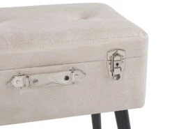 This vintage form inspired stool perfectly accentuates interiors in modern, traditional, and glam decor. Tailored in beige, faux leather upholstery, the stool features decorative buttons, glossy silver clips and a stylish handle. The sleek legs perfectly compliment the overall design of the piece and give it a minimalist feel. The stool can be opened just like a real suitcase and provides ample storage for all your bits and pieces.
