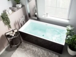 This elegant and straightforward freestanding bath features a modern design, thanks to which it perfectly complements any bathroom. The classic, rectangular shape is highlighted by a black, glossy surface which adds to its sophistication. The tub is made from sturdy and durable sanitary acrylic and is strengthened by a fibreglass layer for extra protection. Its ergonomic design allows for long, comfortable hours of relaxation for one or two people.