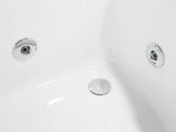 A beautiful corner tub with enough room to comfortably accommodate two people. It is designed with elegant chrome fittings and two padded headrests upholstered in black faux leather. Its large and small jets combined with underwater LED lighting and a wide waterfall tap create a spa-like experience in the comfort of your own home. The bathtub features an elegant design that will suit any bathroom interior.