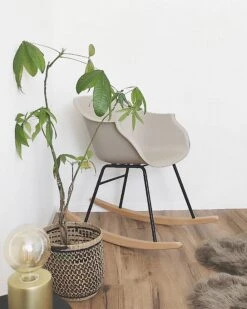 An updated concept of a classic rocking chair, this seat looks great in any home library, bedroom or nursery. Made from plastic, an invitingly curved seat combined with contrasting wooden skates affords a comfortable shape and a gentle rocking motion. The stylish blend of materials and trendy design make it a great addition to interiors in Scandinavian, modern or vintage style.