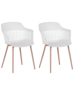 Synthetic dining chairs are a practical and easy-care solution for your home. The set’s durable seats can withstand heavy use and any kind of spills can be effortlessly cleaned with a quick swipe of cloth. The body has a trendy white colour and is supported with sturdy metal legs painted in a way resembling light wood.