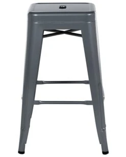 Comfortable, practical and on-trend – this set of 2 grey bar stools is a perfect addition to a dining room in industrial and modern decor. The loft-inspired design is combined with functionality, such as stackable feature that makes them easy to pair with any kind of kitchen set-up, and can also be used in the bathroom, office or garage. Stools are made of powder-coated metal with leg pads to protect your floor and provide a non-slip stand. The cross beams on all four sides can also serve as comfortable footrests.