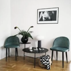 The mid-century influenced look of this side chair ties in seamlessly with any interior style, from modern through boho to glam. Its sleek silhouette features slanted legs and invitingly curved back assuring high sitting comfort. Upholstered in rich blue, velvet fabric it looks fantastic by a dining table, makes a luxe vanity seat or even a perfect occasional chair for a living area.