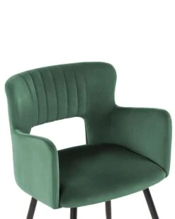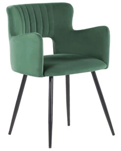These chairs are all about modern design, they present a retro-inspired silhouette mixed with functionality, high-quality materials and comfort. A padded seat comes with armrests and a backrest with eye-catching cut-out detail. The smooth velvet upholstery gives depth and sheen to the colour, complementing slanted, powder-coated black legs. Vertical tufting on the inner back lends chairs an elegant touch. With that universal design, this seat would look fantastic by the dining table in a home office or bedroom.