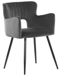 These chairs are all about modern design, they present a retro-inspired silhouette mixed with functionality, high-quality materials and comfort. A padded seat comes with armrests and a backrest with eye-catching cut-out detail. The smooth velvet upholstery gives depth and sheen to the colour, complementing slanted, powder-coated black legs. Vertical tufting on the inner back lends chairs an elegant touch. With that universal design, this seat would look fantastic by the dining table in a home office or bedroom.