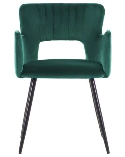 These chairs are all about modern design, they present a retro-inspired silhouette mixed with functionality, high-quality materials and comfort. A padded seat comes with armrests and a backrest with eye-catching cut-out detail. The smooth velvet upholstery gives depth and sheen to the colour, complementing slanted, powder-coated black legs. Vertical tufting on the inner back lends chairs an elegant touch. With that universal design, this seat would look fantastic by the dining table in a home office or bedroom.