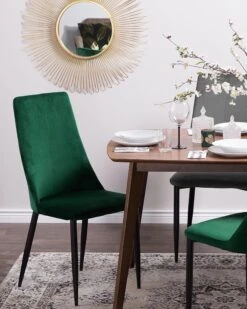 This set of two chairs adds a modern touch to any kitchen or dining room. The green upholstery, neat seams and long, sleek legs make the piece elegant in its simplicity. Carefully crafted black details greatly underline the colour of the chair. Thanks to the high, slightly rounded backrest and soft padded seat, the chair provides perfect sitting comfort.