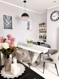 These chairs are a combination of retro-inspired design with industrial form and classy colour. A wide, decorative quilted seashell backrest contrasts with urban metal legs and raw sticking at the back, creating an eye-catching composition. Chairs are perfect to use in a dining set-up, as a dressing table seat or an occasional accent piece.