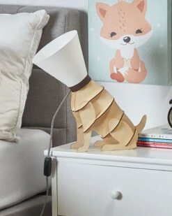 This table lamp has been designed as a perfect functional piece for a living room – or a children’s bedroom. Manufactured from wood and with a synthetic lampshade, it casts a delicate upwards glow, giving a restful, calming light. Shaped like a dog, it introduces a playful accent, that goes well with a wide range of interior styles.