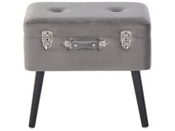 This vintage form inspired stool perfectly accentuates interiors in modern, traditional, and glam decor. Tailored in grey, polyester velvet upholstery, the stool features decorative buttons, glossy silver clips and a stylish handle. The sleek legs perfectly compliment the overall design of the piece and give it a minimalist feel. The stool can be opened just like a real suitcase and provides ample storage for all your bits and pieces.